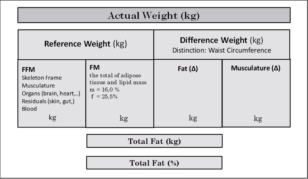 Up to that level, an increase in weight, however, could not be differentiated into fat or muscle mass. For that reason, the circumference of the abdomen (AC) as a marker for central obesity was integrated into the DBA model. Processed through a network of algorithms the DBA model enabled to differentiate the Difference Weight – that means the difference between the Actual Weight and the Reference Weight – into fat mass (ΔFM, kg) and skeletal muscle mass (ΔSMM, kg). The following diagram illustrates the conceptual design of the DBA model (Figure 2).