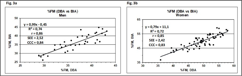 Figure 3.Relationship between percent fat mass (%FM) derived by BIA- and DBA-method for men (a) and women (b). Solid line, regression line; R²: coefficient of determination; r: Pearson`s correlation coefficient; SEE: standard error of estimate. CCC: Lin`s concordance correlation coefficient.