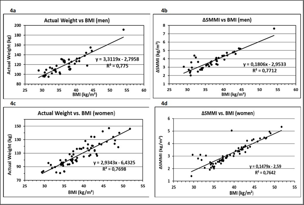 Obesity is associated with functional limitations in muscle performance. Skeletal muscle mass (SMM), a key component of adipose tissue-free body mass in humans, is central to the study of nutritional, physiologic, and metabolic processes. The true effect of obesity on skeletal muscle mass, including any interactions with aging effects, was analysed in a follow-up study 19. It investigated the impact of obesity on the stimulation of muscle growth, based on the same dataset as described before. The increase of skeletal muscle mass (ΔSMM, kg) compared to the individual reference weight was calculated and adjusted to height (ΔSMMI, kg/m²). The increase in the association between Actual Weight, and ΔSMMI with BMI is demonstrated for men (Figure 4a-b) and women (Figure 4c-d). The mean values of ΔSMM as an estimate of muscle mass gain calculated by the DBA-system were 11.8 kg for men and 8.9 kg for women, respectively. The data followed a linear, significantly rising relationship with BMI (ß > 0, p<0.001). The result underlines that the relationship between BMI and SMM becomes more specific, when body weight is virtually stripped of fat mass and organs and normalized for height squared.