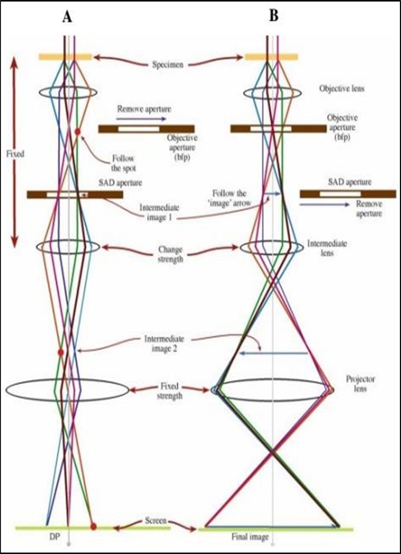 When taking image (Figure 11), an objective aperture is inserted in the back focal plane of the objective lens to select one or more beams that contribute to the final image (BF, DF, and HRTEM). Including the direct beam into the objective aperture bright field image is formed (BF), while selecting only scattered beams, dark field image (DF) can be received. Switching from real space (image) to reciprocal space (diffraction pattern) is easily achieved by changing the strength of the intermediate lens 61.