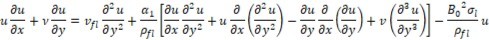 Here u , ν are the horizontal and vertical velocity components, respectively v fl. is the kinematic viscosity, ρfl is the density of fluid B0 is the magnetic effect involved in the model for MHD, σ is the surface tension, αfl is is thermal diffusivity of the fluid, the ratio between heat capacity of the nanoparticles (ρc)np and heat capacity of base fluid (ρc) fl. DBr is Brownian diffusion, DTh is Thermophoresis.