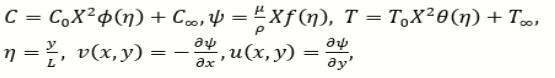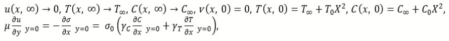 where r=(C0 𝜸C)/(T0 γT ), M=(L2 σl B0)/μ, Pr=νfl /αfl is the Prandtl number Nb=(ρc)np DB𝜸 C0 x2) / (ρc)lf L2 a), Nt=(ρc)np DTh x2) / (ρc)lf L2 a), L= μν fl)/(σ0 T0 γT) are the Marangoni factor (r), modified Hartman number (M), Prandtl factor (Pr), Brownian motion parameter (Nb), Schmidt number (Sc), Thermophoresis parameter (Nt) and reference length (L), respectively. The second grade fluid parameter (α) is defined as α1/(ρfl L2).