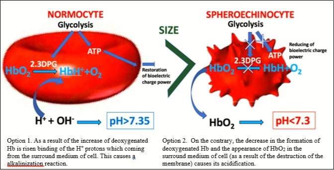 The decrease in the formation of 2.3 DPG leads to the acidulation of intracellular environment of the RBCs. Deoxygenated hemoglobin which was previously formed actively binds the H+, that comes from the extracellular environment and alkalizes the extracellular environment. The effect of RBC reduction, the appearance of widespread spheroechinocytes is observed in microscopy. Subsequently, oxyhemoglobin moves to the extracellular environment as a result of processes intensification destruction of the membranes of RBCs. The accumulation of oxygenated hemoglobin in the extracellular environment causes by shifting towards the acid of the pH.