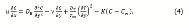 Here u, v represent the velocity components in x, y directions, respectively. μ is symbol of dynamic viscosity, v is the kinematic viscosity, ρf represents the density of fluid, K is used for chemical reaction, σ the surface tension, T0 and C0 are temperature and concentration on the surface, α is representing thermal diffusivity of the fluid, k is symbol of thermal conductivity of fluid. 𝜏 is used for ratio between heat capacity of the fluid, k is symbol of thermal conductivity of fluid. 𝜏 is used for ratio between heat capacity of the nanoparticles (PC)p and heat capacity of base fluid, (PC)f , DB is Brownian diffusion, DT is Thermophoresis, and qr is the typical radiative heat flux that can be written through Rosseland's approximation as follows: