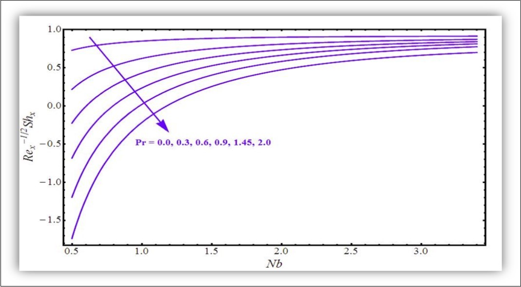 movement of nanoparticles from the surface of Riga. Figure 10 is the display of influence of radiation factor (Rd) on the temperature profile. Temperature profile receives prominent enhancement in its behavior with elevated values of radiation factor. Thus the addition of radiation factor enhances the heat flux up to a significant level. Figure 11 is plotted to analyze the behavior of concentration of nanoparticles against the variation in Brownian motion factor (Nb). The stronger Brownian motion factor enhances the in-predictive motion of fluid particles that results in enhancement of temperature distribution. This enhancement in temperature drops down the concentration of nanoparticles near the Riga surface. The concentration profile enhances with elevated values of Schmidt number (Sc) for certain reasons as shown in Figure 12. The main reason is the enhancement in Brownian diffusivity that results in enhancement of associated boundary layer of concentration of nanoparticles in the base fluid. Elevated values of both the chemical reaction and radiation factor result in decreasing behavior of the concentration profile displayed in Figure 13 and Figure 14, respectively. The enhancement in chemical reaction results in away movement of nanoparticles from the surface that ultimately effects the concentration in the base fluid. The elevated values of Thermophoretic factor (Nt) result in enhancement of heat flux but drops down the mass flux while the enhancement in Prandtl results in decreasing behavior of the Sherwood number (the mass flux) as plotted in Figure 15, Figure 16 and Figure 17.
