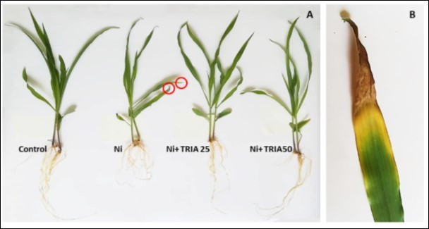 Figure 1. A) A Growth comparison of 21-day-old maize seedlings (control—untreated plants, Ni—plants exposed to Ni stress alone, Ni+ TRIA 25—plants exposed to Ni stress and treated with 25 μM triacontanol, Ni+ TRIA 50—plants exposed to Ni stress and treated with 50 μM triacontanol). B) Symptoms of injury on leaf tips, especially in mature leaves, caused by Ni exposure.
