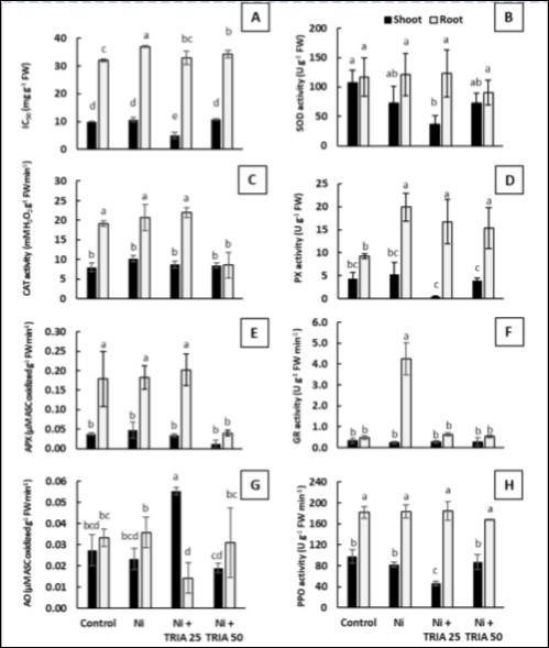 Figure 4. Effect of triacontanol (TRIA) (25 and 50 μM) on A) scavenging activity of DPPH expressed as IC50 value B) Superoxide dismutase (SOD) activity, C) Catalase activity (CAT), D) Peroxidase activity (PO), E) Ascorbate peroxidase (APX) activity, F) Glutathione reductase (GR), G) Ascorbate oxidase (AO) activity and H) Polyphenol oxidase (PPO) activity measured in shoots and roots of maize plants exposed to Ni stress, as compared with the control untreated plants. Data are means ± SD (n=3), bars with different letters are significantly different at P ≤ 0.05.