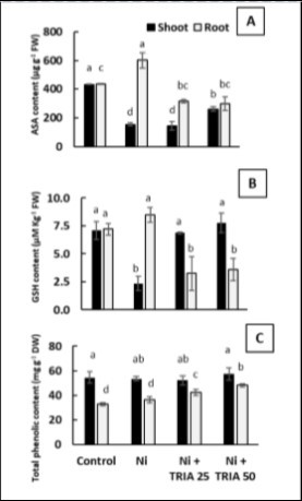 Figure 5. Effect of triacontanol (TRIA) (25 and 50 μM) on A) Ascorbic acid content (ASA) B) Reduced glutathione content and C) Total phenolic content of maize plants exposed to Ni stress, as compared with the control untreated plants. Data are means ± SD (n=3), bars with different letters are significantly different at P ≤ 0.05.