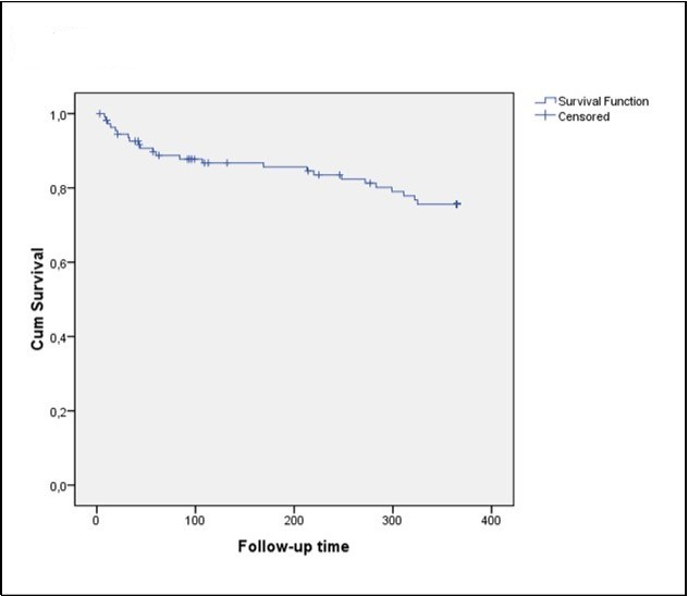 One of the main limitations of this study is the sample size nevertheless there were few ones lost to follow-up. It has reduced the probability of selection bias. The highly homogenous distribution of some variables can be explained because the sample recruited from admissions to a hospital serving an area whose residents are mainly elderly people with high comorbidity.