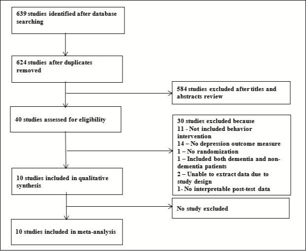 Data extraction from included studies was done using Excel spreadsheets. Details of the methodology, background demographic variables, baseline depression and dementia status, intervention and control methods, duration and dosage of interventions, and of depression outcome measures were extracted from the studies. If the depressive outcome was assessed more than one time, the result of the assessment that was taken at time immediate or closest to the termination of the intervention was chosen.