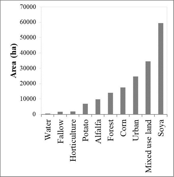 Mapping results are presented in Figure 10. Soybean was the crop covering the greatest cultivated area (59500 ha), followed by maize (17477 ha), alfalfa (9724 ha), potato (6850 ha), and light vegetables (1780 ha) (Figure 8). Soybean was the prevailing crop, covering an area 24.5% greater than that of maize. The “mixed use lands” class (urban, rural and indeterminate zone areas), with an area of 34600 ha, and “urban areas”, with 24740 ha, ranked second and third, respectively, in the general land cover ranking in the study area.