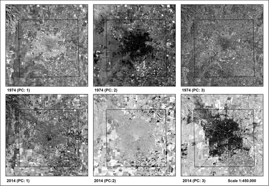 The historical and present boundaries of Córdoba city were delimited with a multi-temporal principal components analysis (PCA) 12 using Landsat 1 MSS (Multi Spectral Scanner) image of 60 m of spatial resolution acquired on 12/06/1974 and a Landsat 8 OLI (Operational Land Imager) image of 30 m resolution acquired on 24/07/2014. The method consists of combining both images in a single data stack using the set of spectral bands corresponding to each sensor, except for the thermal bands. Since the images have different pixel size, the PCA was performed for each image date separately. The analysis aims at reducing spectral dimensionality of each image and generating new synthetic bands (principal components, PCs) that summarize the greatest variability of the original information. Accordingly, the urban areas were better differentiated by PC2 for 1974 and PC3 for 2014. Thus, discrimination of urban covers for each data was maximized, which allowed us to delimit their spatial distribution with greater accuracy (Figure 2). Urban perimeters were delimited using the ISODATA unsupervised classification algorithm. This type of algorithm is used to partition a spectral image into a given number of classes based on the statistical information of the image; it does not require human supervision for training 13. The obtained urban covers were monitored by visual inspection using the Landsat images employed in the PCA, as well as Google Earth images. The comparative analysis of the urban area was performed within the limits of the Capital department, covering a total of 58 neighborhoods distributed between the northern and southern sectors of the GBC.