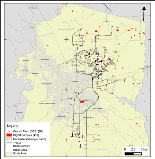 The training strategy of SVM was conducted based on geolocation of field samples (direct observation of crops) and by visual interpretation on a SPOT image. Field visits were made to the study area between April and June 2015 (Figure 3). For that purpose, a legend was constructed to define in the field the different land cover and use types present in the region: summer crops (soybean, maize, alfalfa), pesado horticultural crops (potato, sweet potato, carrot), light horticultural crops (lettuce, chard, spinach, etc.), mixed land use (vacant parcels, abandoned fields, roadsides, weedy plots), urban areas, forest areas, bare soil or fallow land and water. Given the small size of horticultural plots (light), very often of smaller size than the resolution of the sensor used, we decided not to include them in the classifier. For their identification, high-resolution Google Earth images were used and polygons were manually digitalized, and then added as a mask to the already classified map. This procedure helps to avoid confusion with other classes of similar phenological cycles and ensures a more accurate fit of the final horticultural area. Location and characteristics of the classes observed in the field were geolocated with GPS (Global Positioning System); a total of 96 locations were recorded, which were then used in the classification assessment phase. The result was evaluated using two indicators: overall accuracy (OA) and Kappa coefficient, both derived from the confusion matrix 15.