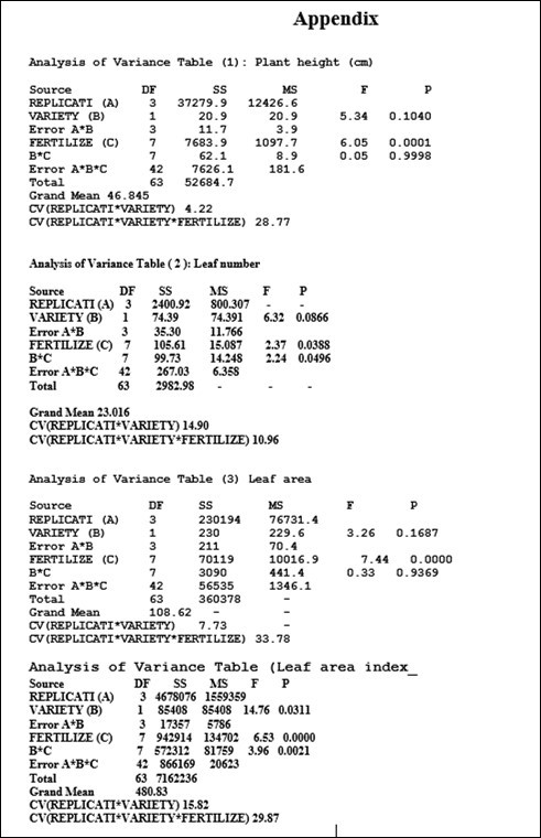 The results in the Table 3 and Figure 3; demonstrated that the overall leaf area of Serena and Opera cultivars has significantly increased in the field experimental units which treated with Guano and Nitrogen compared with untreated units (F= 7.44, P < 0.001). Moreover, the result showed that there is non-significant difference in the leaf area of Serena and Opera cultivars due to application of either Guano or Nitrogen. Furthermore, the two cultivars “Serena and Opera” responded similarly (F= 3.26, P < 0.1687) to Guano and Nitrogen treatments.