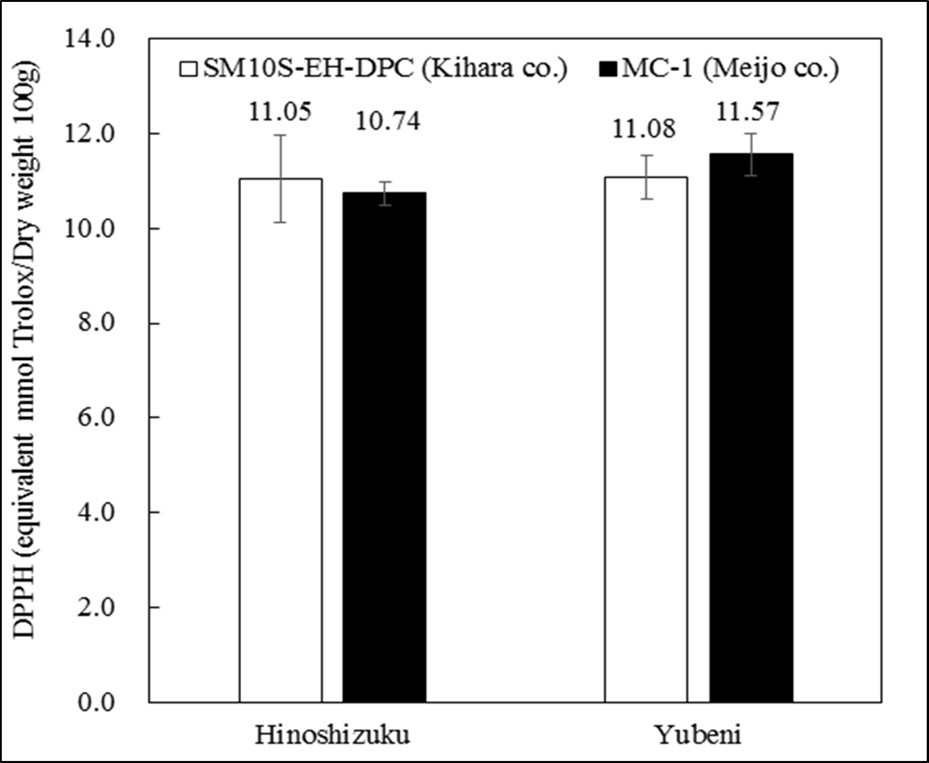Figure 1 shows the difference in the total quantity of polyphenols between different models of hot air dryers. The content of each polyphenol was about 4% for Hinoshizuku and about 7% for Yubeni, and the dryer made by Akagi (MC-1) was higher than the dryer made by Kihara (SM10S-EH-DPS). It was speculated that the difference in polyphenol content in this result was due to the involvement of polyphenol oxidase, that is, the decrease in enzyme activity due to heating 21. Temperature conditions and water activity have been reported as factors that affect polyphenol oxidase activity 22. It was considered that different models of dryers had different amounts of heat during drying due to the differences in the capacity of the drying chamber, heat sources, and the like. The dryer SM10S-EH-DPS and the dryer MC-1 were dried at the same temperature (40°C) and the same time (10 h). However, since MC-1 has a smaller drying chamber than SM10S-EH-DPS, it was speculated that the calorific value was higher and the polyphenol content was different.