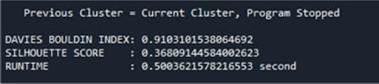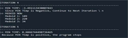 For the PAM algorithm, we use the same dataset from the previous part of k-means (240 data). Figure 5 illustrate the data initialisation of using PAM. To start the algorithm, we have fixed a number of clusters k = 3. In this program we have proposed a TCMP coefficient that can be calculated at each iteration, if TCMP is negative we continue the iterations. The iteration stop in the first positive TCMP value and note the medoid values in order to determine the clusters (Figure 6 & Figure 7). Performace measure is given in Figure 8, and the distribution of clusters is illustrated in figure 9.