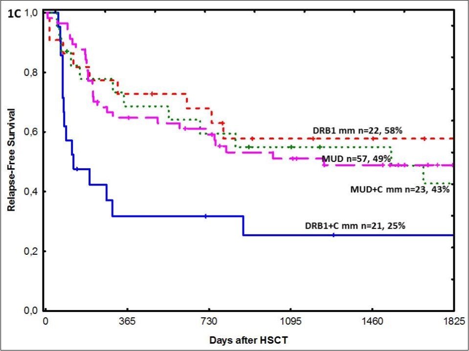 The 5-year overall survival was 52% and 62% (p=0.27), and relapse-free survival was 42% and 47% (p=0.18) in DRB1-MM and MUD patients, respectively. Non-relapse mortality at one year was 12% and 15%, respectively (p=0.55). The cumulative incidence of relapse at 5 years was 46% in DRB1-MM patients and 35% in MUD patients (p=0.03). However, additional HLA-C mismatch affected the result negatively in the DR-mismatch cohort but not in the MUD cohort.