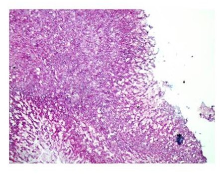 A 64-year-old lady presented to the outpatient department with complaints of headache and right eye blurring of vision for one month. Neurological examination revealed that bitemporal hemianopsia and impairment of visual acuity. Findings from fundus examination were within normal limits. Rest of the brain appeared unremarkable. Endocrine evaluation was normal. Results of renal function tests, liver function tests and haemogram test were within normal limits. A clinical diagnosis of non-secretory pituitary adenoma was made. Magnetic resonance imaging showed a well-circumscribed contrast-enhancing lesion in the sella (Figure 1, Figure 2). The patient underwent an endoscopic endonasal/transsfenoidal surgery in the supine position and total lesion resection was peformed. Intraoperatively, the lesion was found to be yellow colour, soft and avascular and it was removed totally until the sella turcica was visualized (Figure 3).In histopathologic examination septate hyphae were observed between inflammatory cells, Grocott staining is positive, but acid-fast stain for acid-fast bacilli (AFB) was negative. Histopathological findings suggest that infection of Actinomyces (Figure 4, Figure 5). We performed to patient consulted by patients to infectious diseases clinic. Patients underwent intravenous 6x2 gr ampicillin for four weeks.Then oral 4X500 mg amoxicillin treatment is planned a for at least 6 months. Patient did not have any deficits in the next six months.