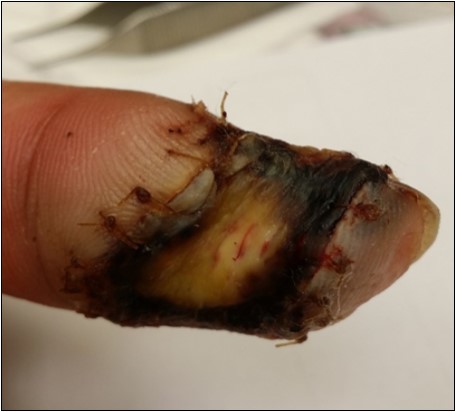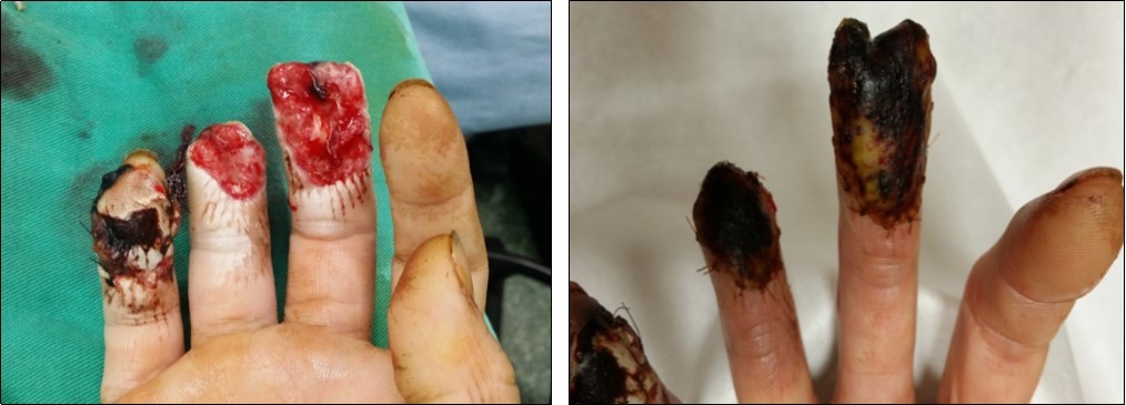 Case 6. 54 y/o male. Chemical burn, full thickness burn wound of right middle finger; tendon exposure. (Figure 19, Figure 20, Figure 21).