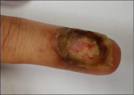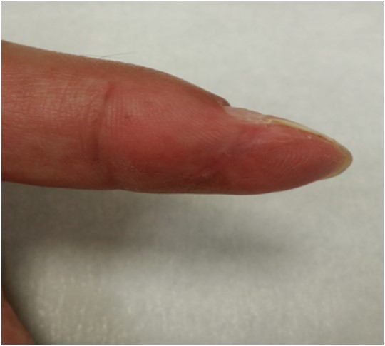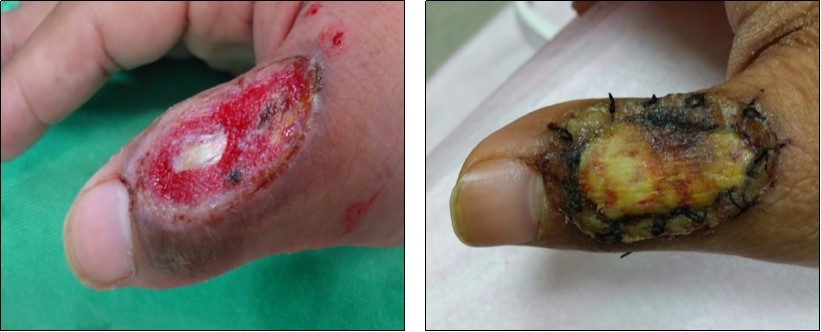 Case no. 2. 48 y/o, female. Laceration wound of right index finger; dorsal oblique soft tissue defect; nail bed defect; over DIPJ with bone and joint exposure. (Figure 5, Figure 6, Figure 7, Figure 8.)