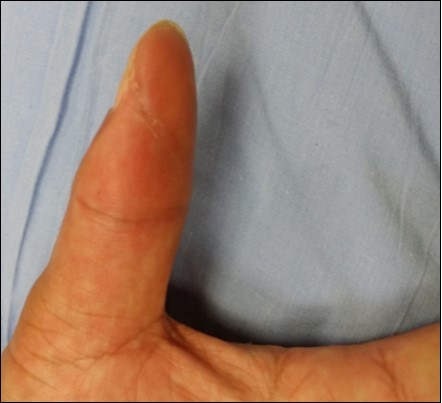 Case 4. 44 y/o female. Laceration wound of the left thumb; dorsal oblique soft defect; nail bed defect. Over D IPJ with bone and joint exposure. (Figure 14, Figure 15.).