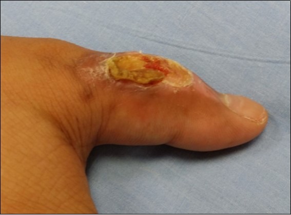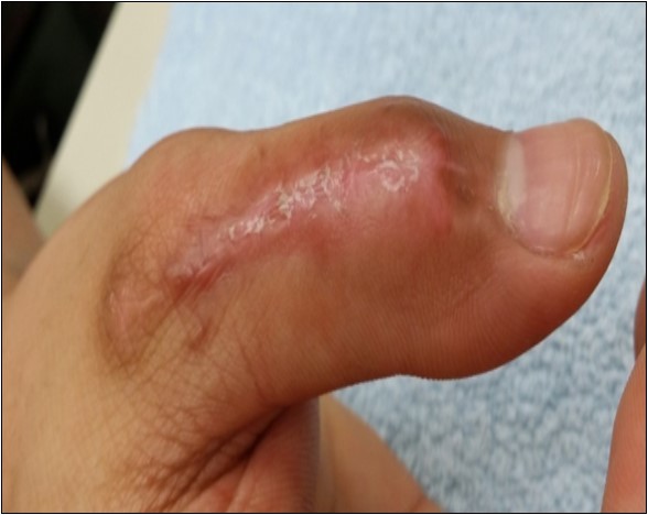 Case 5. 24 y/o male. Contact full thickness burn wound of right thumb; soft tissue defect of dorsal side of the IPJ; tendon exposure. (Figure 16, Figure 17, Figure 18)