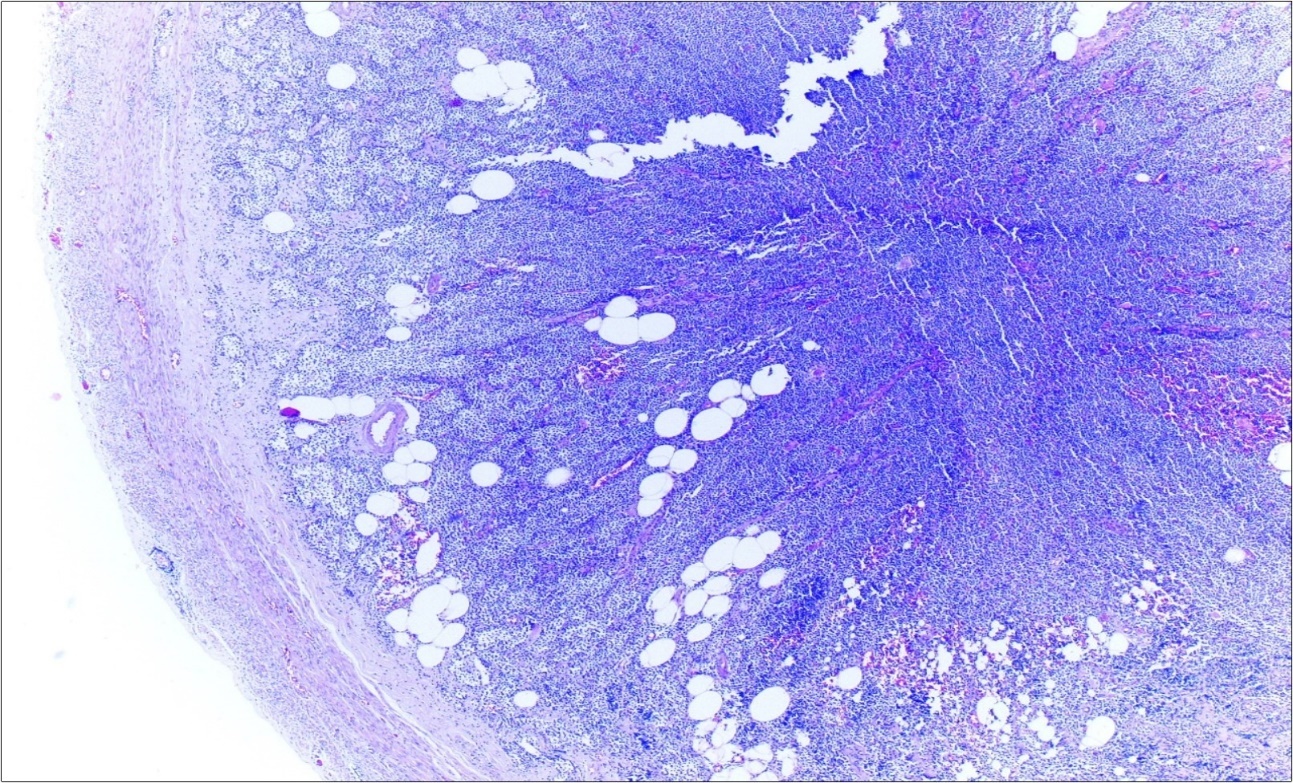 Figure 1.Appendix lumen infiltrated with B lymphoid cells (h&e;x100)