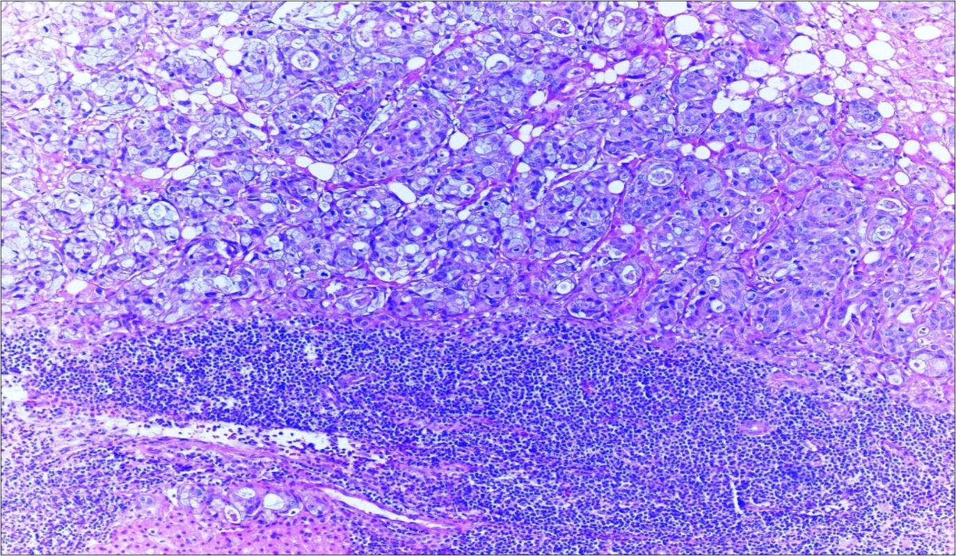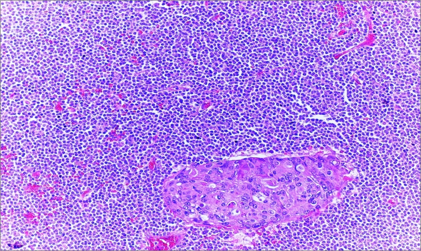 Figure 6.Adenocarcinoma with MALT lymphoma infiltration of lymph node (h&e;200)