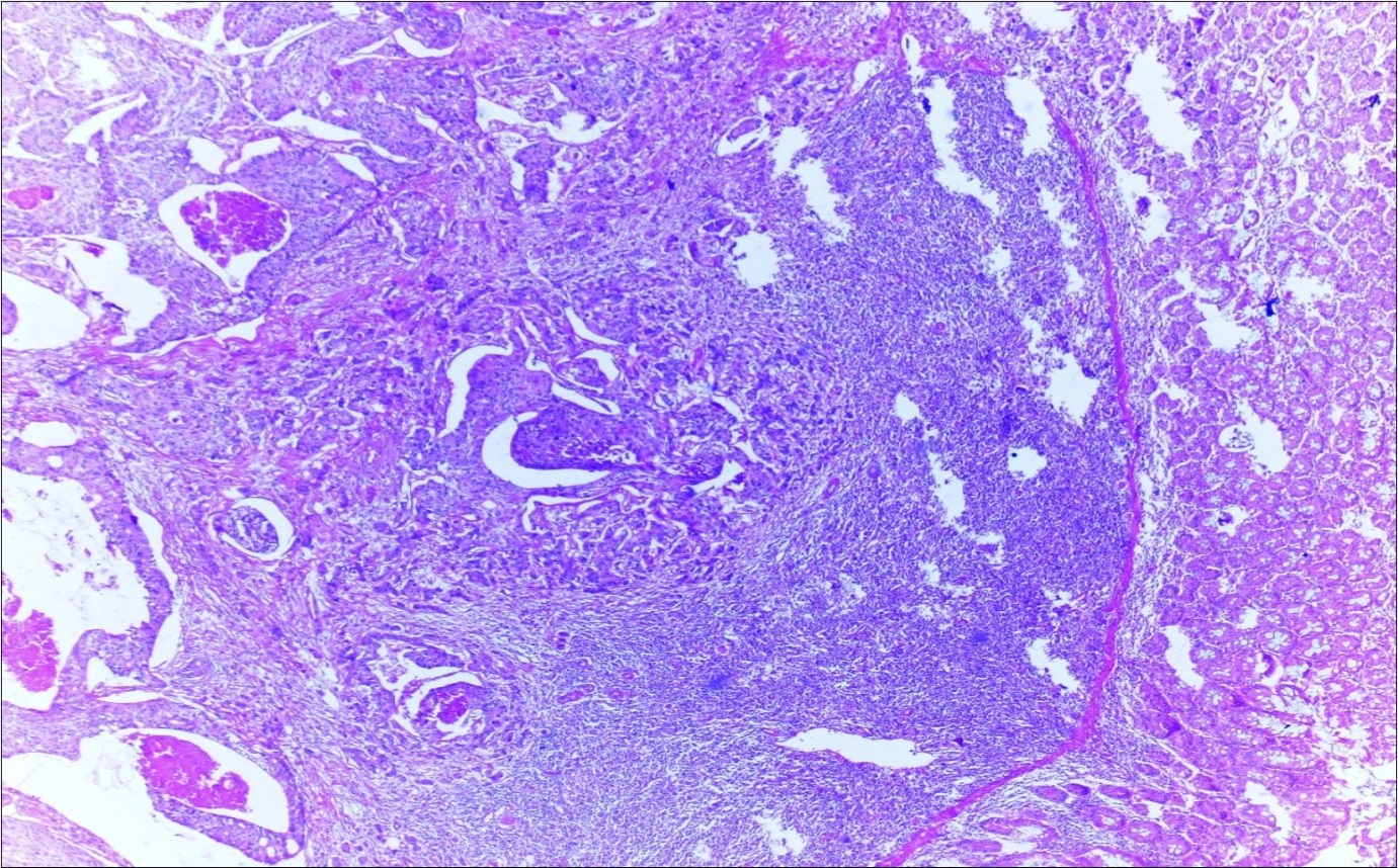 Figure 4.Adenocarcinoma with MALT lymphoma infiltration of liver (h&e;200)