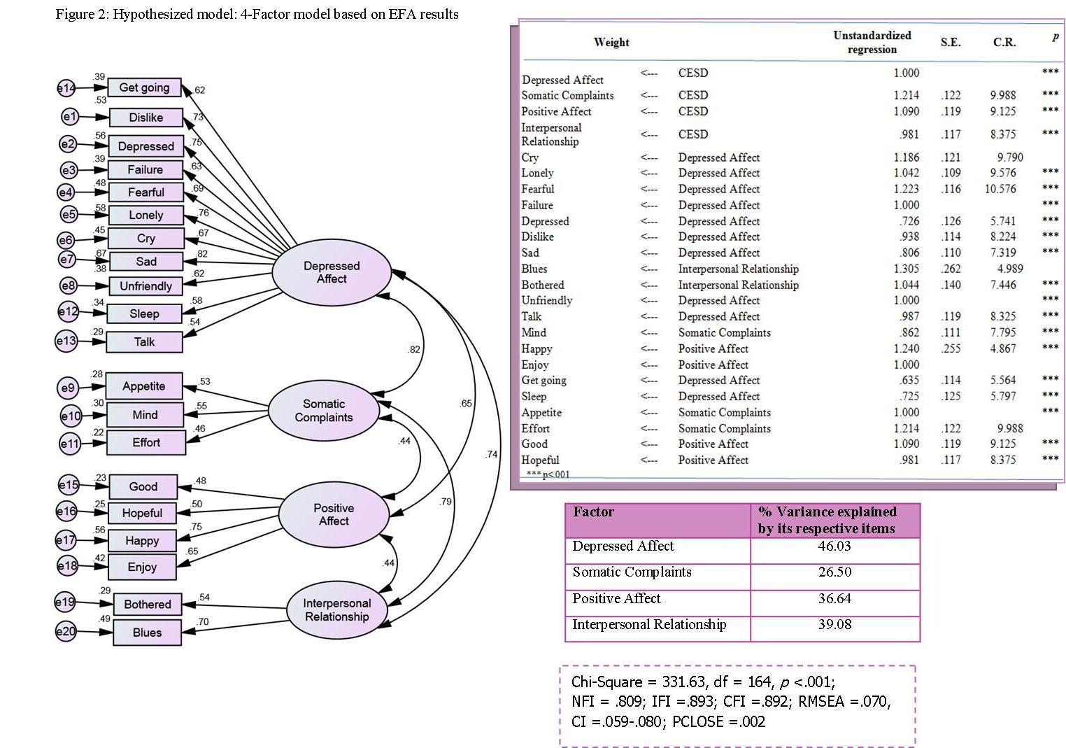 To cross-check whether or not the 4-factor structure as proposed by Radloff holds true, we constructed a visual diagram of the CES-D based on Radloff’s recommendation and ran an analysis. Results in Figure 5 revealed that 2 of the average explained variances were <50%, while the other two were >50%. Model fit indices indicate somewhat model fit (Figure 5). However, multicollinearity exists between 2 pairs of factors with a Person’s correlation of >.9043: Depressed Affect and Somatic Complaints; and Somatic Complaints and Interpersonal Relationships. The high correlation values indicate that these 3 factors measure relatively the same concept and should be restructured. Therefore, it is evident that the 4-factor CES-D model based on Radloff’s recommendation does not fit our data well.56