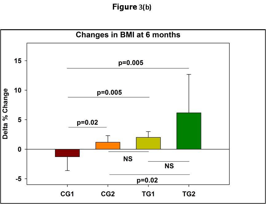 Figure 3.Changes in the patients BMI from baseline at 3 and 6 months of the commencement of the Trial.In (a) and (b) the means and standard deviations are shown. In (c) the median and standard errors are shown. * p<0.05; ** p<0.01 per group as compared to time 0.