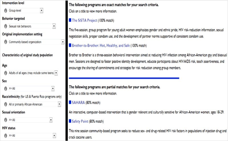 An online HIV EBI Search Assistant has been created. The Search Assistant, freely available from the HAPPA website (http://www.socio.com/pdf/happasupplementary.pdf), helps guide practitioners in selecting the HIV EBIs that are the best match for their local contexts. Users of the Search Assistant can search for relevant EBIs by one or more key criteria, including: intervention level (individual level, group level, community level); behavior targeted (injection drug use, sexual risk behaviors, both injection drug use and sexual risk behaviors); original implementation setting (clinic/hospital/treatment facility, community-based organization, community-wide neighborhood/city/county); age (adolescent and young adult, adults of all ages); sex (all male, all female, both male and female); race/ethnicity (all or primarily African American, all or primarily Hispanic/Latino, all or primarily Asian or Pacific Islander, all or primarily White, no predominant race/ethnicity); sexual orientation (lesbian/gay/bisexual including MSM, heterosexual, unknown); and HIV status (negative/mixed/unknown/not reported, positive). The search results display a list of HIV prevention EBIs exactly and partially matching the search criteria inputted by the user, with links to additional information about these EBIs and the opportunity to purchase/download them immediately, if desired. Figure 1 gives an illustrative HAPPA search (input and results).