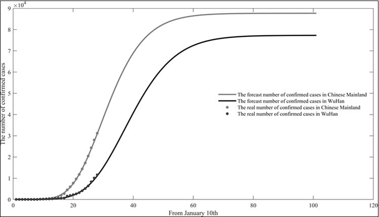 Figure 8.Prediction results of cumulative number of confirmed cases in China and Wuhan.