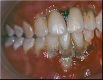 The patient under hard emotional stress that associated with bacterial plaque promoted ANUG with necrosis of alveolar bone and marginal gingival soft tissue in 31 and 41 (Figure 1). The patient was free of systemic disease and was not currently receiving any medication. Initial therapy was carried out using Er-YAG laser, to promote scaling and root planning and oral hygiene instruction. After initial therapy (Figure 2) the surgical method employed consists of the following steps as described by Langer and Langer5.