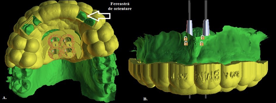 The digital model (stereolitography (STL) files) was superimposed on the CBCT scan (DICOM file (Digital Imaging and Communication in Medicine) file in order to facilitate the optimal positioning of the 4 mini-implants in the anterior hard palate.