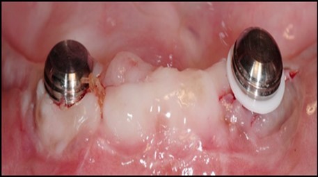 Post operatively after 3 months, osseointegration was evaluated clinically and radiographically (Figure 5a,b) and the implants were well prepared to receive the prosthesis. The second stage surgery was performed in which cover screws were removed and healing abutment were inserted into the implants (Figure 6). After a time period of two weeks, peri-implant soft tissue healing was examined, and existing denture was relined after relieving at the abutment site. Later, the healing abutment is removed using a 1.25 mm hex driver. Internal portion of the implant is irrigated and dried to make sure if it is free of debris and soft tissue. A periodontal probe was used to measure the gingival cuff height at the right and left canine site of implant location. Selected ball abutment were placed onto each implant using 1.25 mm hex driver and 30 Ncm torque wrench (Figure 7A).