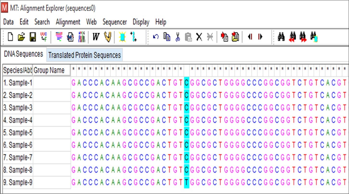 Figure 2.Nucleotide sequence aligned with gi|448814763:759807-763325 M tuberculosis H37Rv, reference sequence for screening of rpoB gene mutations out of which only sample-9 shows mutation at codon 531.