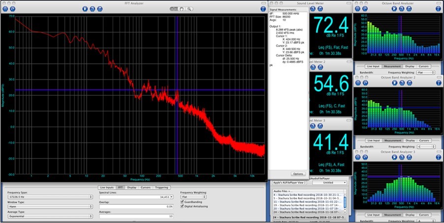 5) Analysis of the .wav files stored by the SAM Scribe or from the converted iPhone recordings were conducted using the MacOS application by Faber Acoustics 15, Electroacoustics Toolbox, Version 3.9.9. The Electroacoustics Toolbox application provides the ability to calibrate the system for each microphone calibration recording, so that can be used to produce calibrated outputs from the microphone. The application was used to perform FFT analysis at frequency window widths of 0.5 Hz, 1 Hz, 2 Hz, and 5 Hz. It was also used to generate a calibrated Sound Level Meter output for an A-Weighted, C-Weighted and Z-weighted (Flat) filter, as well as one-third octave analysis at the same filter weighting for each sound sample.