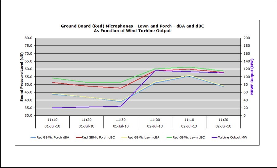 (Figure 7) shows that while the sound pressure levels at the residence drops by 10 to 20 dBC when the forecast MW and output MW of the wind turbine generators drops, if only the output MW drops while the forecast MW does not (indicating the turbine generators were operating in a curtailed fashion) the sound pressure level is not appreciably reduced.
