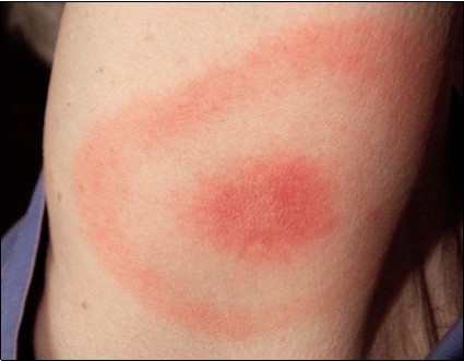 After injecting into human skin, the spirochete may migrate outward producing an annular or spread hematogenously or through the lymphatics to other organs. An infection begins with the characteristic expanding erythema migrans (EM) as previously described by the Europeans in the early 1900’s. Erythema migrans initially develops as a small red spot macule or papule isolated to the site of the tick bite but enlarges within one to two weeks. During this incubation period EM center becomes erythematous and indurated and even vesicular 1. It can be one solid red oval or have the classic “bull’s eye” appearance. On the other hand, most patient may not remember a preceding tick bite due to the size of the nymphal Ixodes richness complex ticks 1.