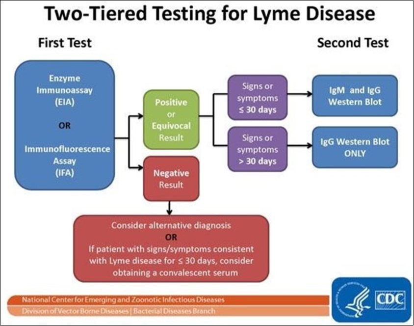 The CDC recommends a two-step process when testing blood 6. These blood tests are most reliable about 2 weeks post-innoculation, as the body has had time to make antibodies. The following diagram shows the steps as laid out by the CDC 6: (Figure 3).