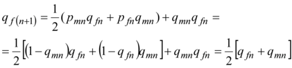 Thus, the frequency of allele a in the women for the following generation is equal to a half-sum of the allele frequencies a in women and man of the previous generation between whom there was a reproductive contact. The formula (4) can be copied in the following kind: