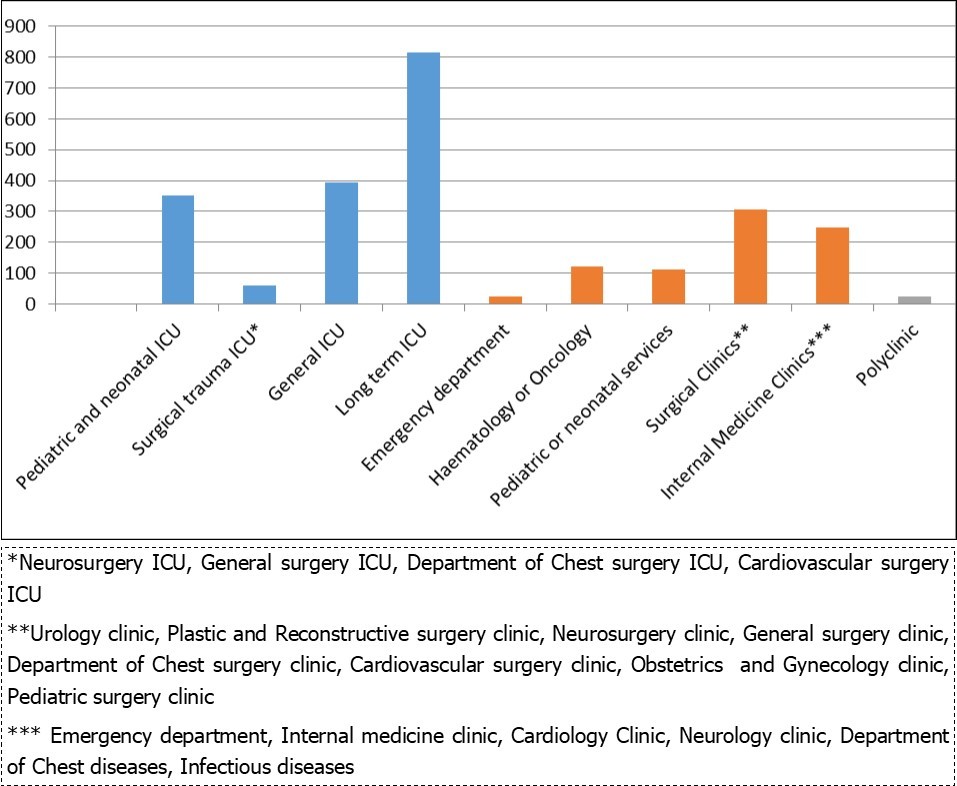 In our study, the increase in resistance to carbapenems from broad-spectrum antibiotics over the years and the high rates detected were considered as worrying. 99.1% of the strains in our study were the samples of hospitalized patients and the majority of them were in the intensive care units (65, 9 %). The high number of carbapenem-resistant K. pneumoniae and their high ratios of resistance are of concern and likely represent the dissemination of resistant clones in the health care setting. In our data, patients with nosocomial infections were overrepresented. This case mixture should be taken into account when interpreting the data.