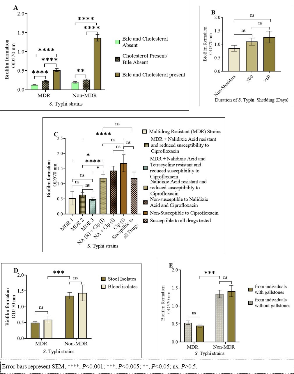 S. Typhi biofilms. (A) Quantity of biofilms after growth in presence/absence of cholesterol and/or bile. (B) Biofilm formation by S. Typhi isolated from non-shedders, patients shedding for one and/or two months (≤ 60days) and from patients shedding the bacteria during and/or after the third month (>60 days). (C) Biofilm formation by MDR and non-MDR strains. (D) MDR and non-MDR strains isolated from blood vs. stool, and (E) strains isolated from individuals with gallstones vs. participants without gallstones