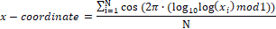 In the Mantissa Arc Test, itwas necessary to calculate a center of mass of the set of values obtained from the mantissa values when considering that the data is distributed in a unit circle, where the center of the circle is given by: