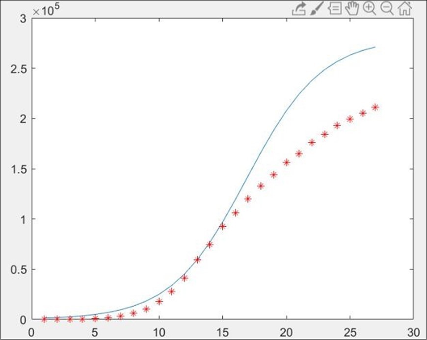 Since COVID-19 has been developing in Italy for a long period of time, and the cumulative number of confirmed cases is relatively large, the data is more convincing, so here we take the cumulative number of confirmed cases in Italy from February 15th to May 3rd The nonlinear model becomes a linear model, and matlab is used for fitting linear regression analysis. Matlab source code is as follows 6, 7, 8, 9: