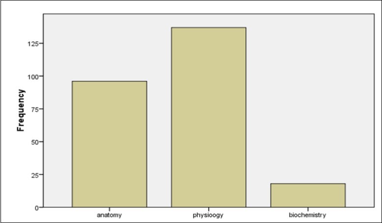 Physiology was the most (54.6%) preferable subject, (46.6 %) of participants mentioned they spent a long time to understand biochemistry compared to other basic disciplines (Table 1; Figure 1).