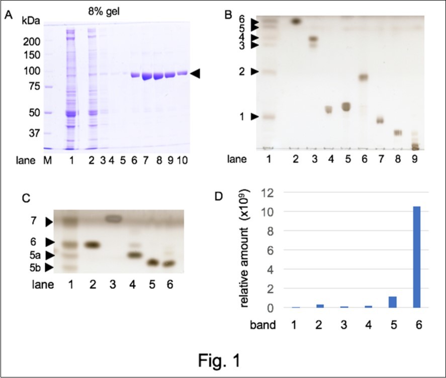 Figure 1.Lipid components in B-dynamin fraction. A. Preparation of B-dynamin through amphiphysin II-SH3 affinity column. Ca2+-dependent membrane binding protein fraction was fractionated with 35% saturated ammonium sulfate precipitation (lane 1) and applied to an amphiphysin II-SH3 affinity column. The flow-through (lane 2), wash (lane 3~5), and bound fractions eluted with high NaCl buffer, pH 6.5 (lane 6~10) were analyzed with SDS-PAGE. Molecular mass markers were applied in lane M. The dynamin band was shown with an arrowhead. Lipid extraction was attempted from dynamin fractions (lane 6-10). B. TLC analysis of the lipid extract (1) and standard lipids (2; CHL, 3; cerebroside, 4; phosphatidylserine, 5; phosphatidylinositol, 6; phosphatidylethanolamine, 7; phosphatidylcholine, 8; sphingomyelin, 9; ganglioside mixture), were developed with chloroform: methanol: water (65: 35: 4) (v: v: v). C. TLC pattern developed with chloroform: methanol: water (65:15: 4) (v: v: v). In lane 1, band 5 and band 6 of Figure. 1B were applied. Standard lipids were CHL (2), TG (3), 24OHC (4), 27OHC (5), and 7OHC (6). Band 5 in Figure. 1B was separated into two bands (5a, 5b) and new band was observed over band 6 on the front line (band 7). Upper half of the TLC plate was shown. D. Relative quantification of CHL with LC-MS. The amount of CHL (m/z = 369.35) detected with the LC-MS analysis of the six bands in B (lane 1) was shown.