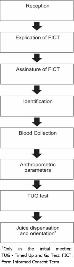 The survey was conducted in three meetings. At the first one the mechanism of the rules and the criteria for the blood collection day were explained, reinforcing the need for fasting; the other two meetings were divided into start and end, following according to Figure 1. In these two meetings, the blood samples and anthropometric measurements were collected and the Timed Up and Go (TUG) test was performed. The volunteers received all the required amount of juice for the thirty days of research in the initial meeting. All the volunteers consumed 400ml daily.