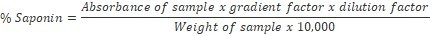 The spectrophotometric method of Brunner17 was used as adopted by Mujeeb et al., 18. One gramme of finely ground sample was weighed into a 250 ml beaker and 100 ml of isobutyl alcohol was added. The mixture was shaken on a UDY shaker for 5 hrs, filtered through a Whatman No1 filter paper into a 100 ml beaker and 20 ml of 40% saturated solution of magnesium carbonate was added and filtered through a Whatman No1 filter paper to obtain a clear colorless solution. One millilitre of the colorless solution was pipetted into 50 ml volumetric flask and 2 ml of 5% FeCl3 solution added and made up to mark with distilled water. It was allowed to stand for 30 mins for blood red colour to develop. Standard saponin solutions of concentration range 0 – 10 ppm were prepared and treated with 2 ml of 5% FeCl3 solution as done for sample above. The absorbance of the sample and standard saponin solutions were read on a Jenway V6300 Spectrophotometer at 380 nm.